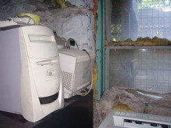 So, there were no organic life forms living in the PC we’re using, which was surprising, given the spider-infested storage area from which the machine was retrieved (see photo). Next, we need to download dyne:bolic. Their download page is a little hard on the eyes. What you’re looking for is either the link that says “download using BitTorrent” (provided you know how to use BitTorrents ) or the section that says “download via ftp from mirrors”. We chose the BitTorrent option, although we aren’t endorsing it; our download still took almost an hour-and-a-half because the torrent wasn’t very well-seeded. You might want to try a regular FTP download.
