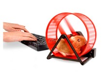 . And while all attention is riveted on their midriff message that screams “I’m a dork!“, you might not even notice that you’re laying down a nice rhythm track on their Electronic Drum Kit Shirt while you beat them senseless. On the home office front, maybe you could use a USB Hamster Wheel as a motivator (YouTube clip here ) . The faster you type, the faster it runs. Or if you’ve ever gone into a panic when software tells to you to “press any key to continue” and couldn’t find the “any” key, we have the Panic Button and Any Key