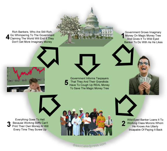 I like to think that in a decade or so, we’ll scan the impoverished Sultan-peppered wasteland of the once deleriously luxurious Dubai, and wonder how it all ever happened. Call me a Gloomy Gus, but waking up to parallel headlines today about how it’s Black Friday and everybody’s going shopping while Dubai’s late payments on their $80 billion debt caused global market panic got me thinking again about the impending econopocalypse. I mean, we’ve all heard of a “jobless recovery”, but is there such a thing as a “recoveryless recovery”? One look at this frightening animated map showing job losses in America between 2007 and 2009 makes me wonder how we can possibly think we’re on the way back to economic stability. Very few people I know have either the liquid assets or the confidence to suggest to me that things are getting better, but at the same time, I don’t see us heading for global catastrophe. In my starry-eyed vision I see more reality sinking in as unexpected debtors like Dubai spring up, and more fictitious capital being generated until the average person snaps out of it and it sinks in that all this money being thrown around is merely a social contract, and one that we never signed. And maybe, somewhere in this morass that is the global economy, we’ll get a little smarter, and remember that what’s good of all is good for the individual. Of course, it’s ultimately moronic of me to think this way; if major UAE-backed debtors like Dubai start defaulting, war is more likely, especially as we ramp back up in Afghanistan. I have this weird hunch we’ll be hearing the name Djibouti a bit more in the coming year. But what the hell do I know? The graphic below sums up my understanding of banking and finance…