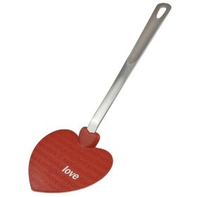 Given the potential stress and expense of Valentine’s Day and today’s science-based eHarmony approach to love, perhaps you won’t find it surprising that rather than lavish chocolates and roses on a lover, millions of people choose instead to show their love for themselves or their dog. And it seems that otherwise, two of the biggest beneficiaries of V-Day love are condom makers and flower shops. According to this article, sales of both spike in February, with roses enjoying a really special boost. Buy on the 15th, and the price drops from $109 to $59. But of the $17 billion dollars spent this Valentine’s day, $10.7 billion will be spent on greeting cards. Breaking this down by gender sort of explains the social networking pattern of men following women on line; of all these billions being spent, men will outspend women almost two to one: $163.37 to $84.72. With the average person spending $119.67. I bet you’re wondering when your partner is gonna even out the averages, right? So anyway, given this focus on self and commerce for Valentine’s day, we’re continuing our tradition of opportunistic holiday Amazon product linking. If you really love us, consider buying something via those links once in awhile! So, we’ve already covered the most amusing Valentine gifts we could find, but at the end were left with a little question: who the HELL ever thought of giving kitchenware as a VALENTINE gift? Yes, nothing says “Gitcher ass in that kitchen an’ fry me a egg, woman” like a Tovolo Heart Shaped Spatula, or Valentine Themed Apron