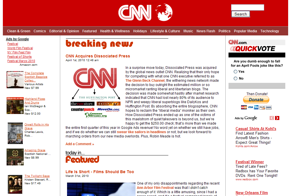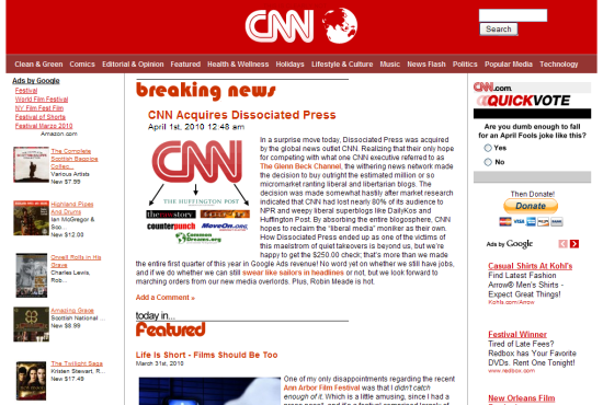 In a surprise move today, Dissociated Press was acquired by the global news outlet CNN. Realizing that their only hope for competing with what one CNN executive referred to as The Glenn Beck Channel, the withering news network made the decision to buy outright the estimated million or so micromarket ranting liberal and libertarian blogs. The decision was made somewhat hastily after market research indicated that CNN had lost nearly 80% of its audience to NPR and weepy liberal superblogs like DailyKos and Huffington Post. By absorbing the entire blogosphere, CNN hopes to reclaim the “liberal media” moniker as their own. How Dissociated Press ended up as one of the victims of this maelstrom of quiet takeovers is beyond us, but we’re happy to get the $250.00 check; that’s more than we made the entire first quarter of this year in Google Ads revenue! No word yet on whether we still have jobs, and if we do whether we can still swear like sailors in headlines or not, but we look forward to marching orders from our new media overlords. Plus, Robin Meade is hot.