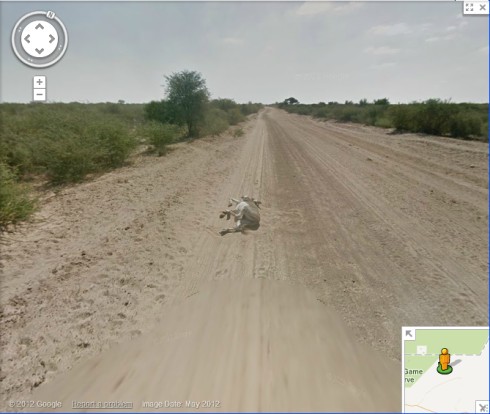 Did a Googlemobile run over a camel in Botswana ? They tend to clean up these images quickly, so here’s a screen grab: